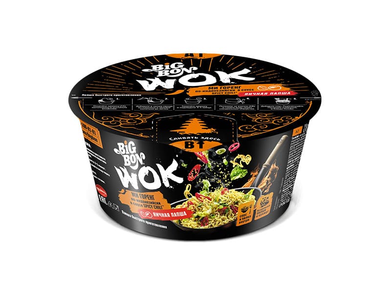Изделия макаронные быстрого приготовления. Яичная лапша «Ми Горенг по-индонезийски в соусе Spicy Chili (Спайси чили)». BIGBON