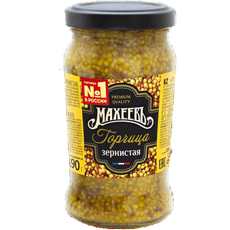 Знаменитая русская приправа, которая производится из цельных семян горчицы. Отлично сочетается с мясом, птицей, сосисками и колбасой. Не содержит ГМО.