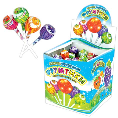 Карамель леденцовая на палочке, ассорти с фруктовыми ароматами.