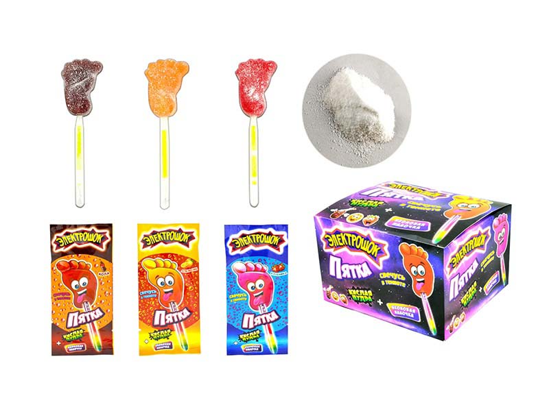 леденец на светящейся палочке в форме пятки с кислой пудрой, ассорти