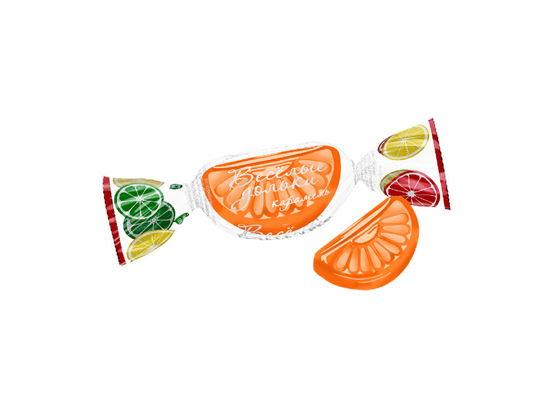 Яркая леденцовая карамель в форме цитрусовых долек со вкусом апельсина