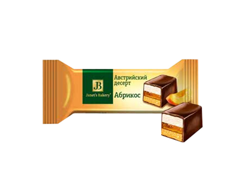 Трёхслойные конфеты от фабрики «Славянка» (Россия), состоящие из ванильного бисквита, абрикосового желе и сливочного суфле в молочной глазури