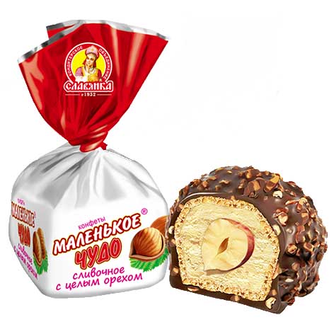 Вафельная конфета с нежной кремовой начинкой, целым фундуком, посыпанная дроблёным арахисом и покрытая шоколадной глазурью.