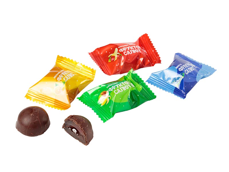 Нежный желейный мармелад с начинкой в темной кондитерской глазури с ароматами "клубника-банан",  "киви-банан", "виноград", "апельсин-лимон".