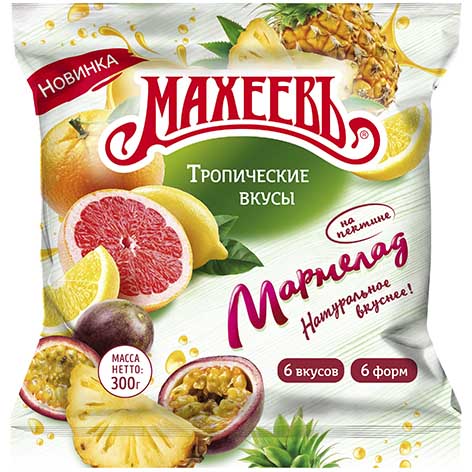 Мармелад желейный, 6 вкусов и 6 форм, с фруктово-ягодным ароматом. Изготовлен на основе пектина с добавлением натуральных фруктовых экстрактов.