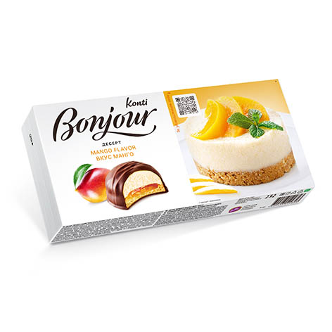 Сочетание светлого сахарного печенья, ароматного желе со вкусом манго и нежного суфле с ванильно-сливочным вкусом в шоколадной глазури, декорированное молочным шоколадом.