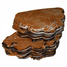 Медовое пирожное из пяти тончайших коржей с прослойкой из вареного сгущенного молока и декорированное белым и темным шоколадом.