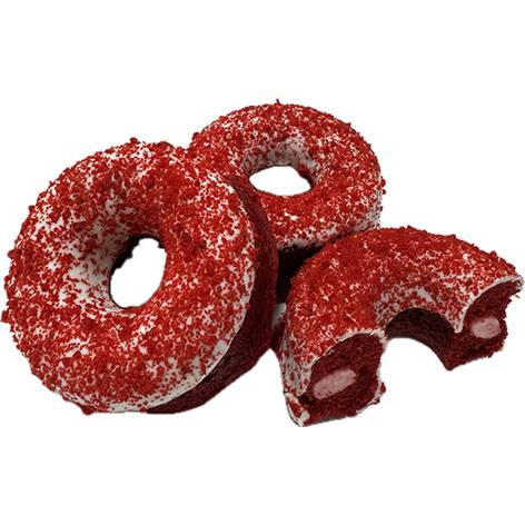 Мягкое, бисквитно-масляное красное изделие с йогуртовой начинкой, покрытое шоколадной глазурью, украшено красной  крошко