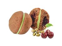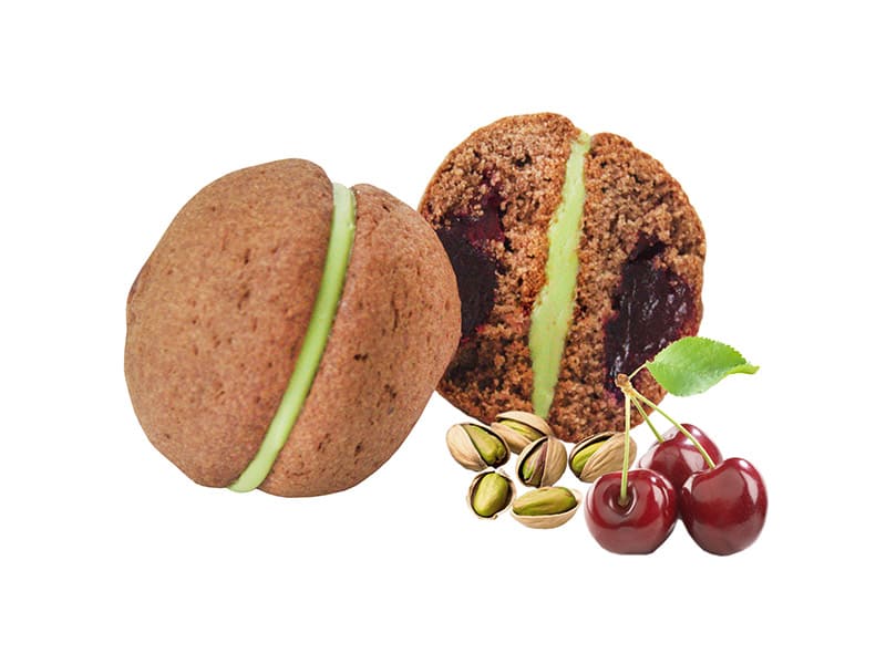 Шоколадное печенье с вишнёвой начинкой внутри, с прослойкой из фисташкового мусса.